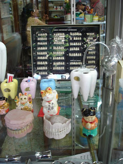 Em Bangkok, uma bizarra vitrine de dentes de porcelana e dentaduras, misturada a gatinhos japoneses e bonecos sorri-dentes em porcelana chinesa.
