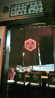Sobe-se uma escadinha ( repare no cantinho esquerdo onde há sempre um montinho de sal ritual ), uma entrada discreta, pouca luz, e lá dentro um ambiente de madeira maciça escura, fumaça e cheiro bom de brasas, um mapa antigo de Tokio, lanternas amareladas,objetos tradicionais japoneses, dá para se imaginar numa ruela antiga do Japão antigo.