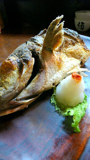 Sobe-se uma escadinha ( repare no cantinho esquerdo onde há sempre um montinho de sal ritual ), uma entrada discreta, pouca luz, e lá dentro um ambiente de madeira maciça escura, fumaça e cheiro bom de brasas, um mapa antigo de Tokio, lanternas amareladas,objetos tradicionais japoneses, dá para se imaginar numa ruela antiga do Japão antigo.